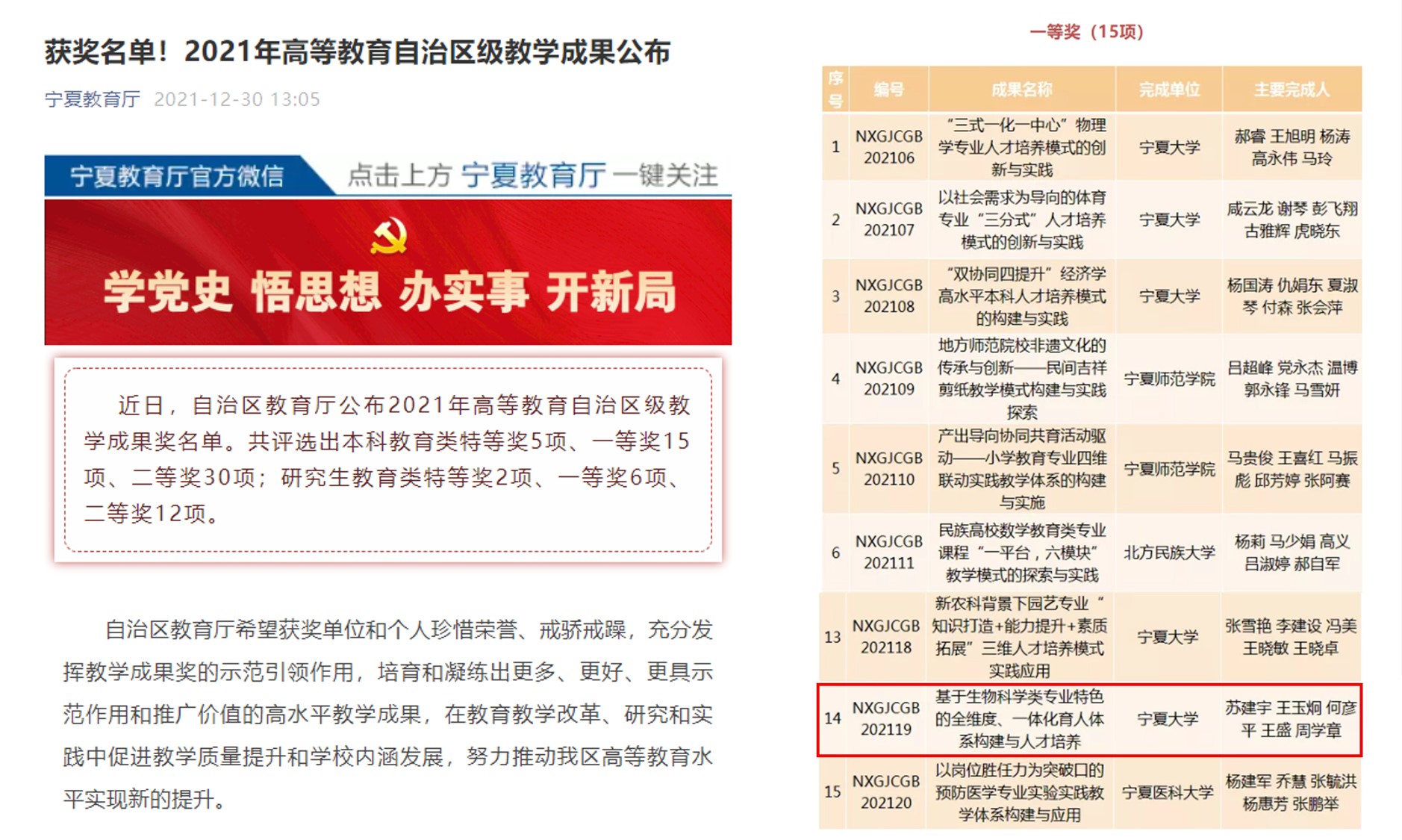 近日,自治区教育厅公布2021年高等教育自治区级教学成果奖名单,betway必威官方网站由苏建宇、王玉炯、何彦平、王盛、周学章等五人完成的“基于生物科学类专业特色的全维度、一体化育人体系构建与人才培养”项目荣获一等奖。