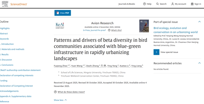 学院动物学学科团队杨英副教授、杨文治副教授带领博士研究生赵富强、袁鹏参加了本次盛会。博士生赵富强通过大会学术委员会遴选,在“鸟类群落生态学研究”分会场中作了以《快速城市化格局下的蓝绿基础设施鸟类群落β多样性及其驱动因素》为题的口头报告。报告系统介绍了基于景观生态学探究银川市蓝绿基础设施的鸟类群落构建格局及其驱动机制的最新研究成果,报告内容受到多位专家学者的关注与热烈讨论,充分展示了学院青年科研人员在鸟类生态学领域的研究实力与创新能力。目前该研究成果以betway必威官方网站为第一研究单位,张大治教授为通讯作者,发表于国际鸟类学领域期刊Avian Research(中国科学院分区:一区TOP,论文链接:https://doi.org/10.1016/j.avrs.2025.100316)。本次会议上博士研究生袁鹏也通过壁报交流等形式展示了最新科研进展。