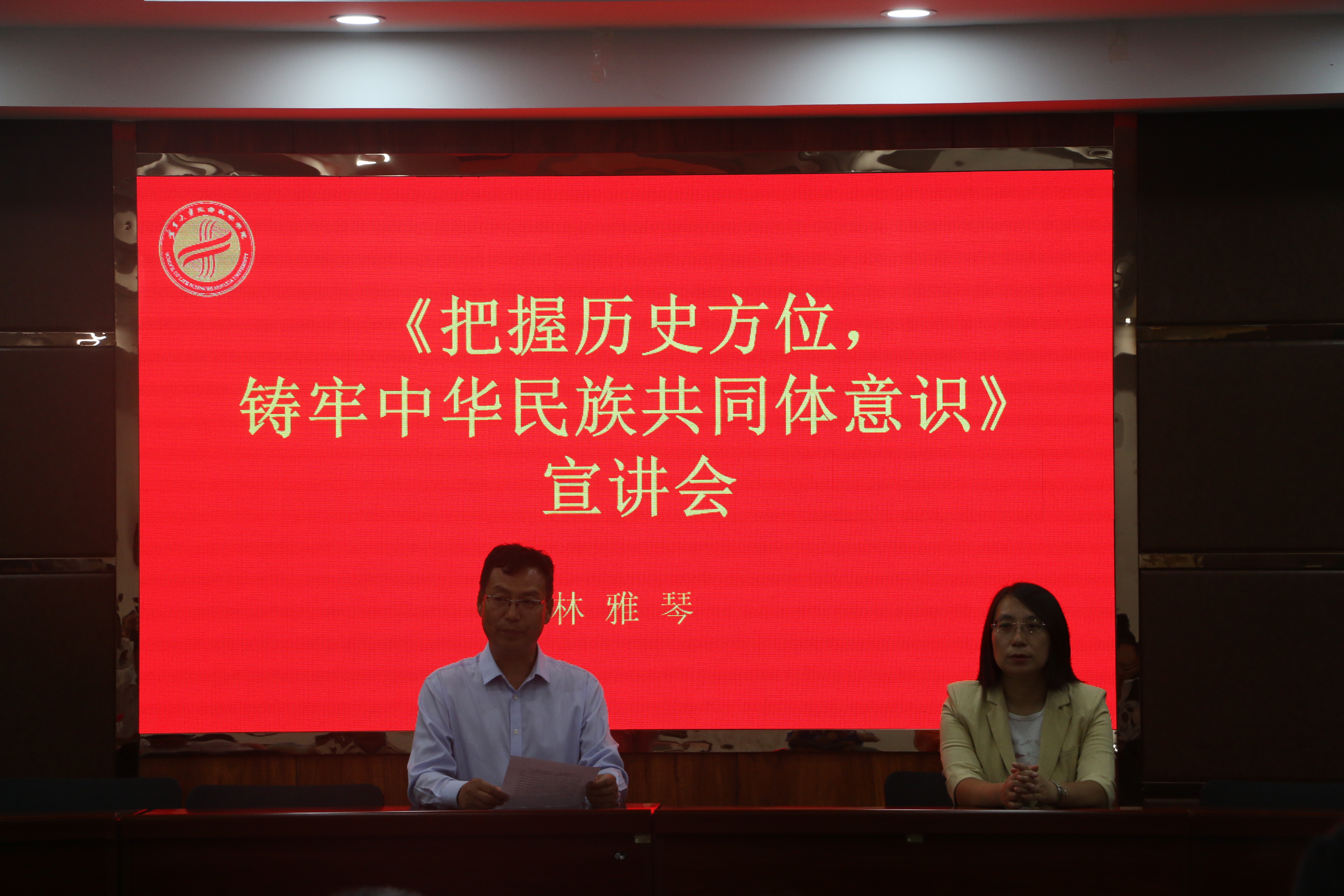 9月14日下午,学院于文萃校区知本楼报告厅举行铸牢中华民族共同体意识宣讲报告会,马克思主义学院林雅琴教授应邀进行主题宣讲,报告会由党委副书记李文华主持,学院全体教职工参加。